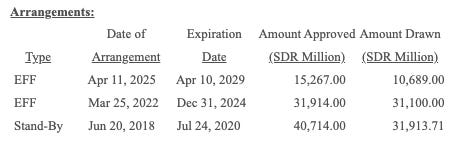 The IMF is the ultimate sovereign lender of last resort, to which Argentina is a frequent patron. (As of April, loans to Argentina, which represents <0.6% of global GDP, represented 34% of the IMF’s loan book.) Currently, Argentina benefits from numerous arrangements with the IMF:
