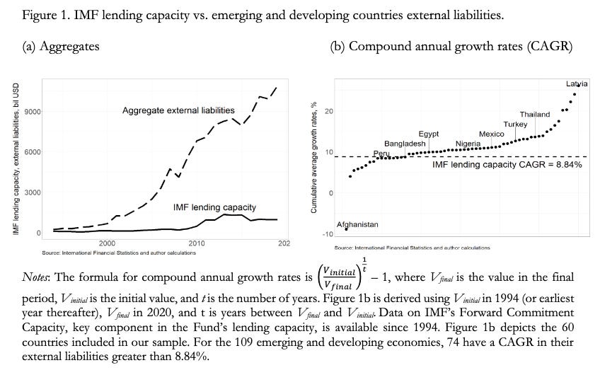 The authors carefully trace the evolution of the IMF’s lending capacity, showing it to decline in size relative to aggregate external liabilities over time. E.g.: