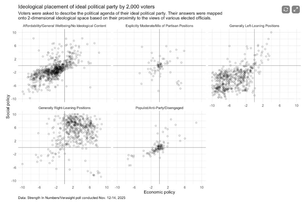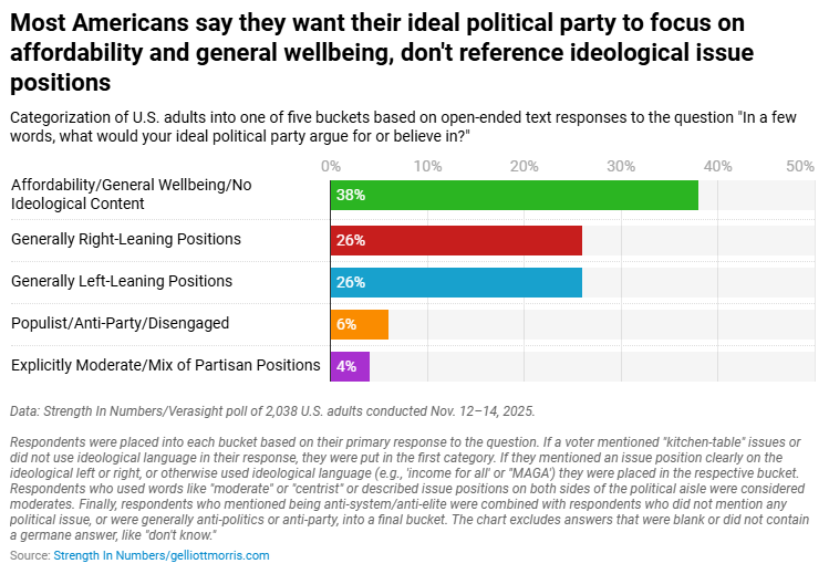 To this end, in our November Strength In Numbers/Verasight poll I asked over 2,000 Americans to describe, in their own words, their ideal political party. This article analyzes those answers and presents several conclusions for general readers, party reformers, and partisans looking for actual data to guide future electoral strategy.
