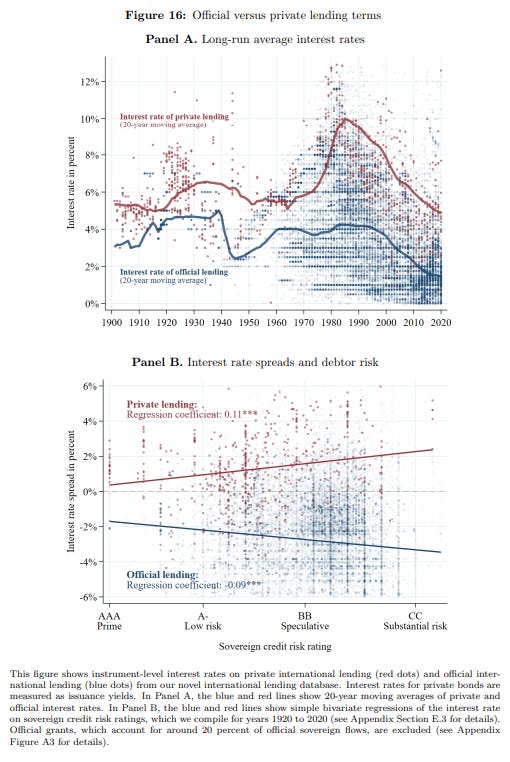 Another equally interesting finding is their application of the workhorse gravity model (gravity models never get old!). They find, empirically, that trade exposure, geographic proximity, military alliance, and status of being a former colony are highly predictive of sovereign lender-borrower links, all else equal. This is perhaps not directionally surprising, but very cool to see validated empirically. For example, they find that military allies receive a 100% higher bilateral official flow volume than non-allies (although the predictive strength of military alliances has declined over time).