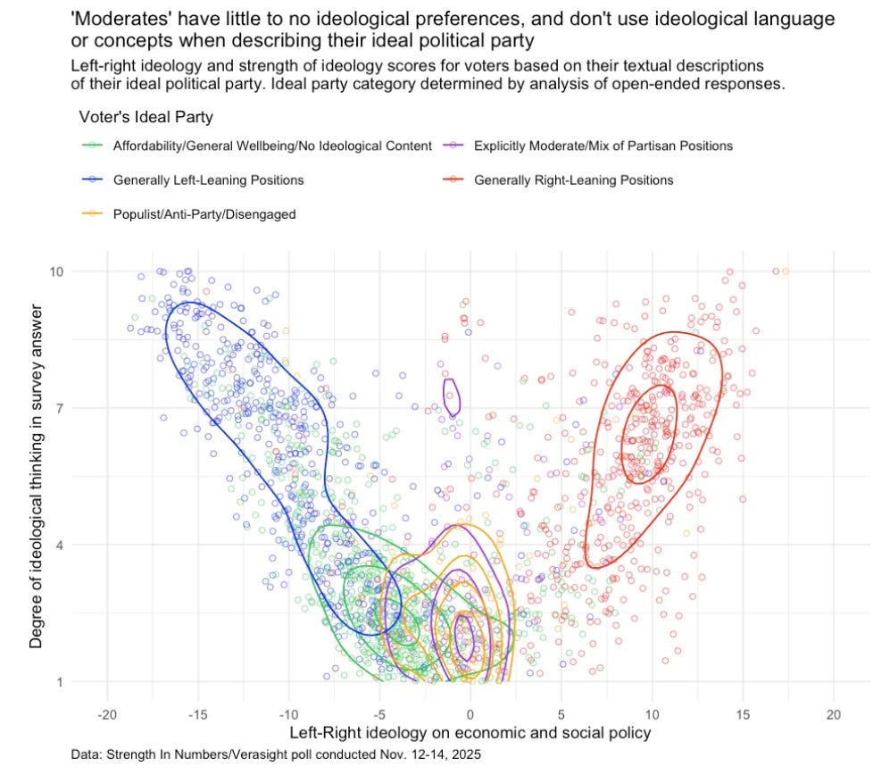 This is kind of surprising! Note that the non-ideological group isn’t “moderate” or “centrist” on the left-right scale (that’s the purple group); they just don’t really espouse partisan views on much at all. In Morris’ words: