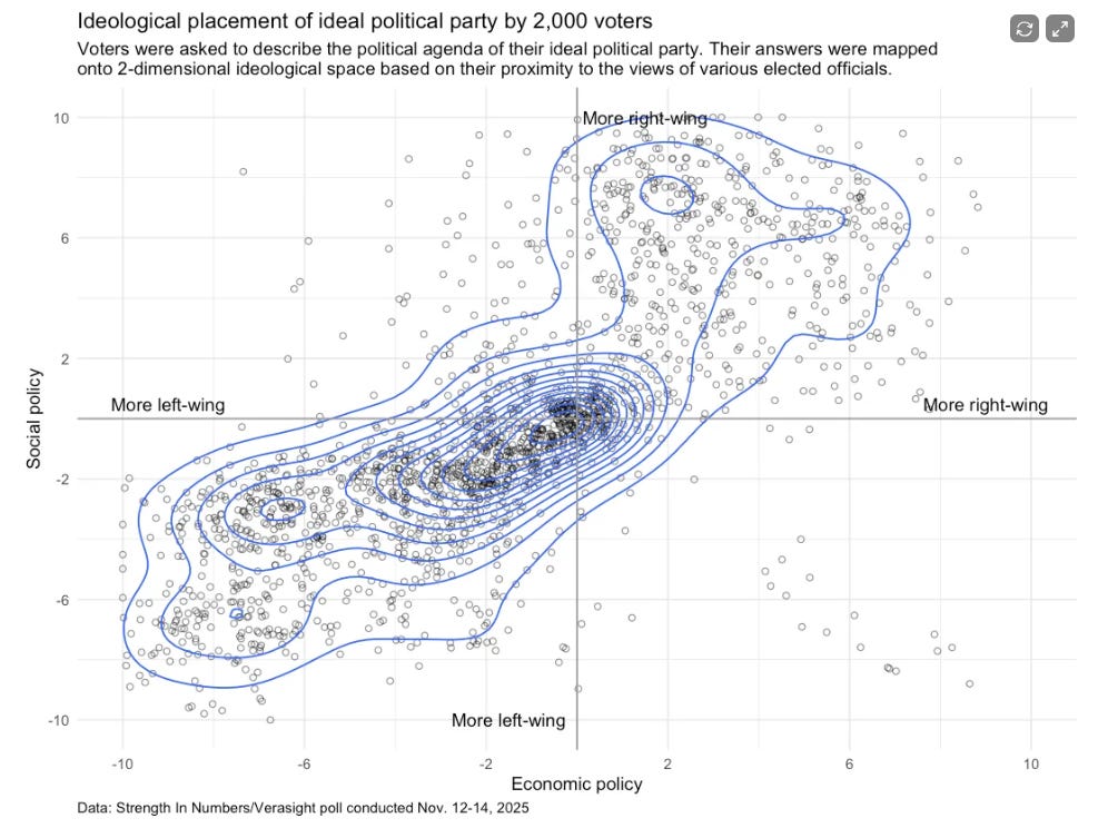 One of my pet interests is political science, in which I would not call myself an expert, but an interested traveler. This excellent essay deserves particular attention. For those who need reminding: the United States does not run ranked-choice multi-member districts with proportional representation. The United States is decided not a parliamentary democracy. The rules of the game in large part dictate the possible universe of outcomes, and in a single-member district first-past-the-post system, we’ll get two parties, more or less. That is not politics; that’s math/game theory. But Americans aren’t so different from other people, so this particular system is reductive to political ideologies. G. Elliott Morris goes to the data to find out what those (considerably more diverse!) political ideologies are. This matters for relatively obvious reasons. In short, per Morris: