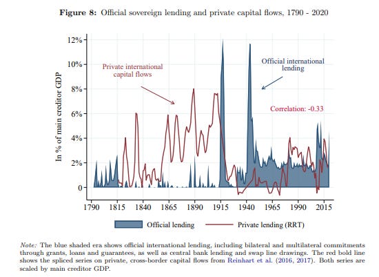It’s hard to overstate the comparative size of official capital flows per this data. The authors report that in major upheavals (e.g., WWI, WWII), official capital flows reached 10% of US GDP. And these data actually understate the “real” official flows, since these data only include official bilateral data, thus excluding sovereign wealth fund investments, which in recent decades have been massive.
