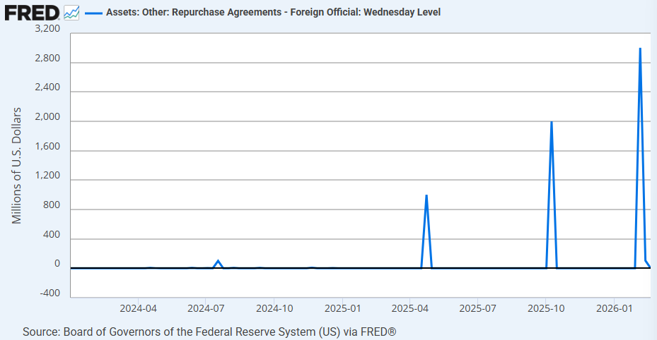 Things in the rest of the world seemed quiet, according to the Report. We’ll all be glad to hear that offshore dollar funding markets are in rude health. Carry traders are at it again in EMs. One other interesting thing happened recently, though, outside of the Report at hand: there was some FIMA Repo activity: balances were up in the first week of February to $3 billion. Here’s a chart: