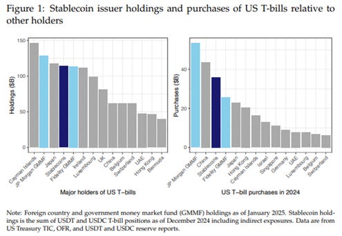 Stablecoin issuers are already one of the largest buyers of Treasury bills, larger even than the entire nation of Japan, per Ahmed and Aldasoro (2025):