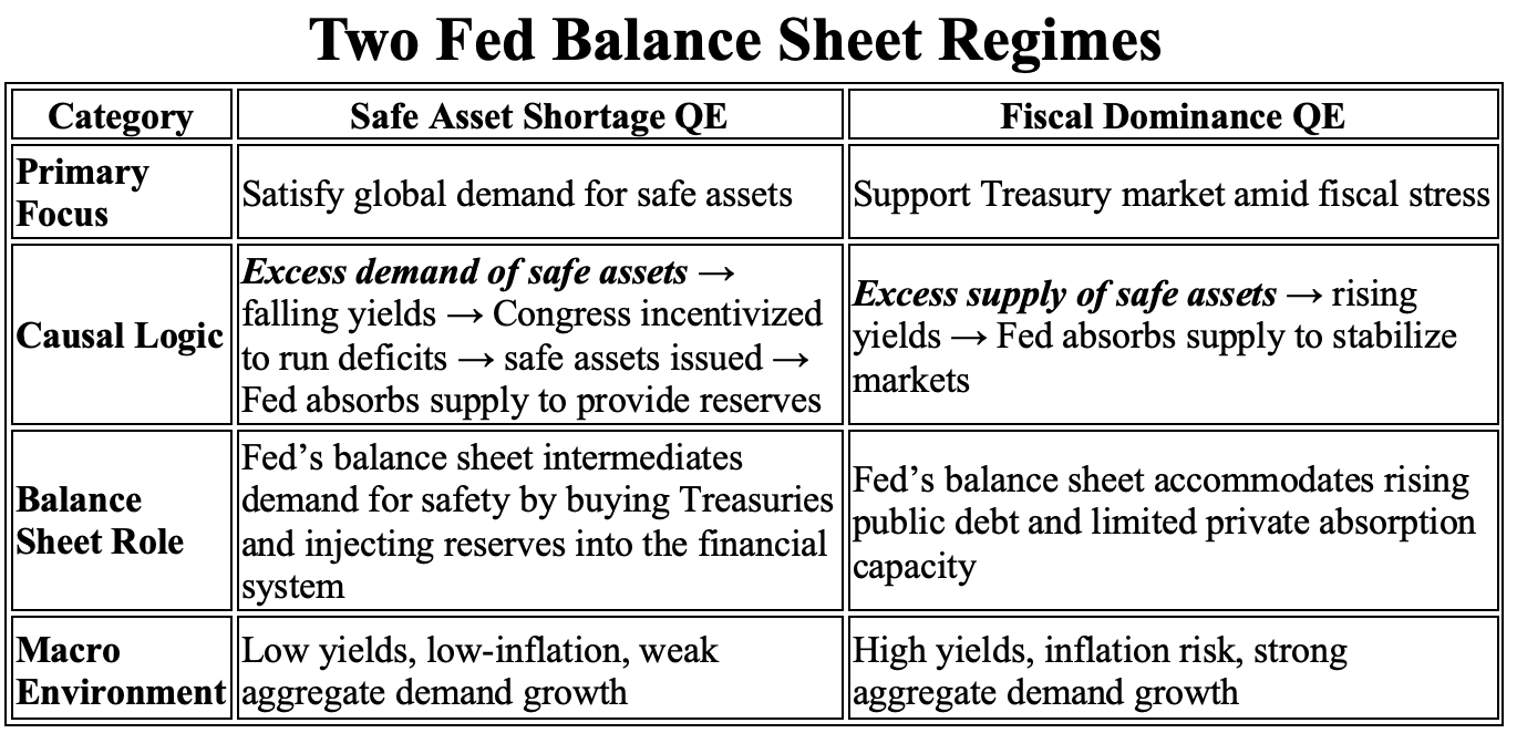 If stablecoins mean greater demand for Fed liabilities, then what kind of balance sheet expansion might this entail? In my view, there are two ways for understanding this process. One view—rooted in the “safe asset shortage” narrative—sees the Fed’s balance sheet expanding to meet an excess demand for safe and liquid assets, with quantitative easing (QE) functioning as a kind of public intermediation service that supplies the safety that private markets cannot. The other view—anchored in concerns about fiscal dominance—sees the Fed’s balance sheet growing in response to an excess supply of safe assets, as mounting public debt pressures the central bank to absorb and manage an expanding stock of treasuries. Stablecoins may intersect both of these dynamics: they could amplify global demand for dollar safety even as they deepen the channels through which the Fed intermediates the government’s swelling debt.