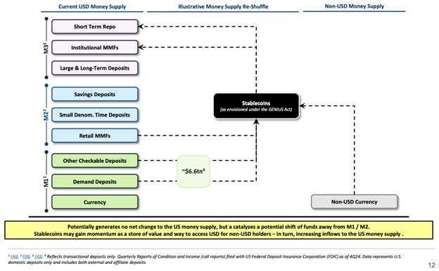 Of course, regardless of fiscal dominance or stablecoin-QE, the composition of the Fed’s balance sheet might change as stablecoins replace other forms of money, as Beckworth lays out in another piece. For one, stablecoin displacement of cash2 could, all else equal, reduce the Fed’s seigniorage income, although a recent proposal for non-interest-bearing “skinny accounts” might limit the disruption. Similarly, there’s the chance that stablecoins eat away at (onshore) bank deposits (I think this is unlikely), in which case, in a world of skinny master accounts, Fed liabilities shift at the margin from banking system reserves to this new form of Fed liability, the skinny master account.