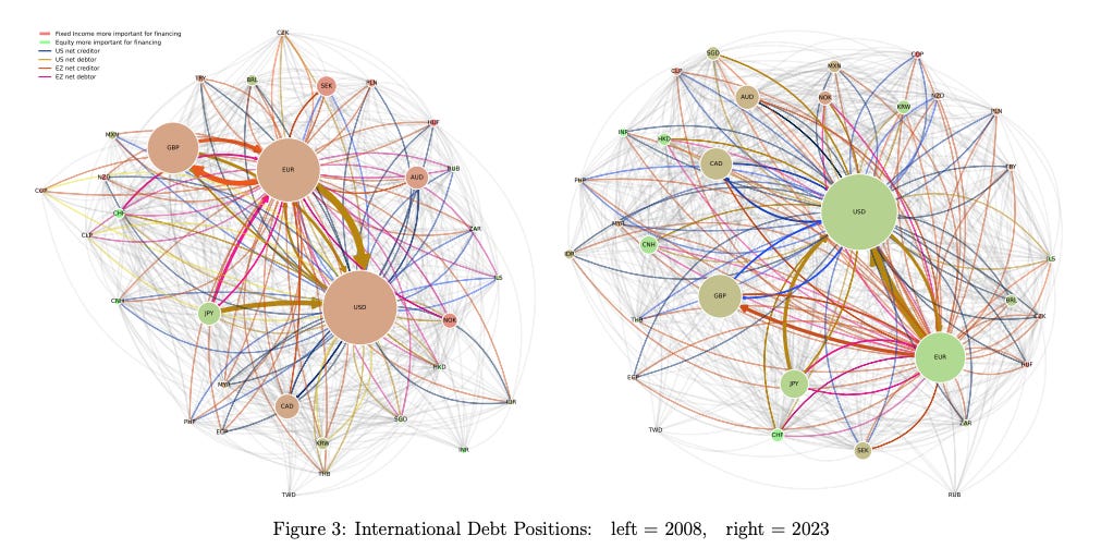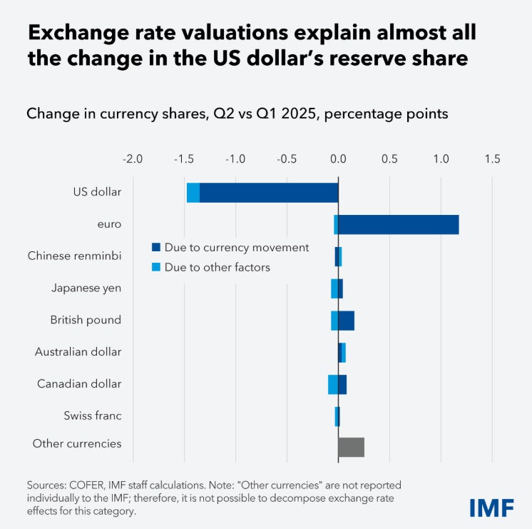 For those in the field, this has been a huge topic of conversation, and to some degree, controversy. The IMF maintains COFER data, which provides aggregated data on the currency composition of reserves (it literally stands for Currency Composition of Foreign Exchange Reserves). If you looked at the data this past year, it looked like the dollar share of reserves had been falling, and that wouldn’t be a crazy conclusion, given the chaos surrounding “Liberation Day,” attacks on Fed independence, massive fiscal overhang, and any number of erratic policy changes in the US. But the trouble is that, as the authors note (emphasis mine):
